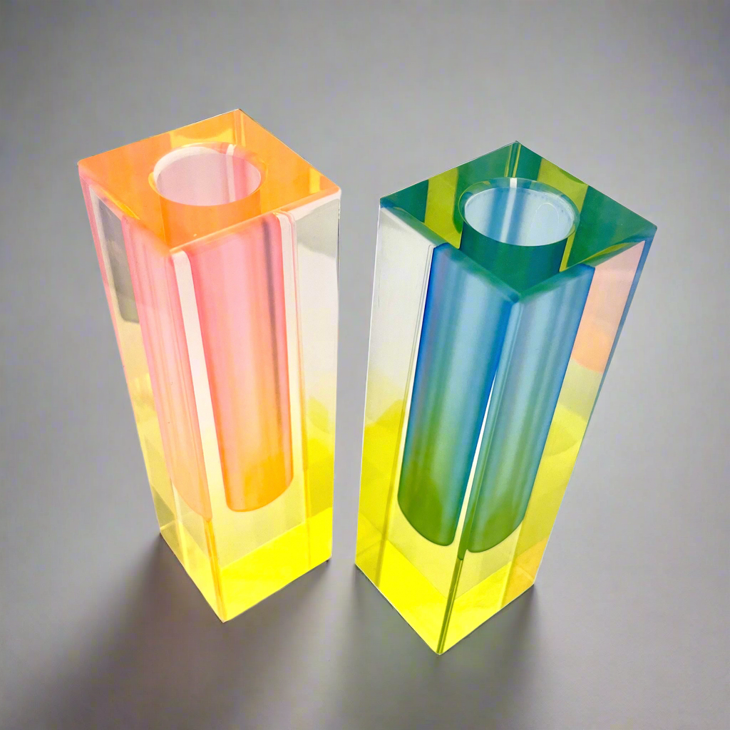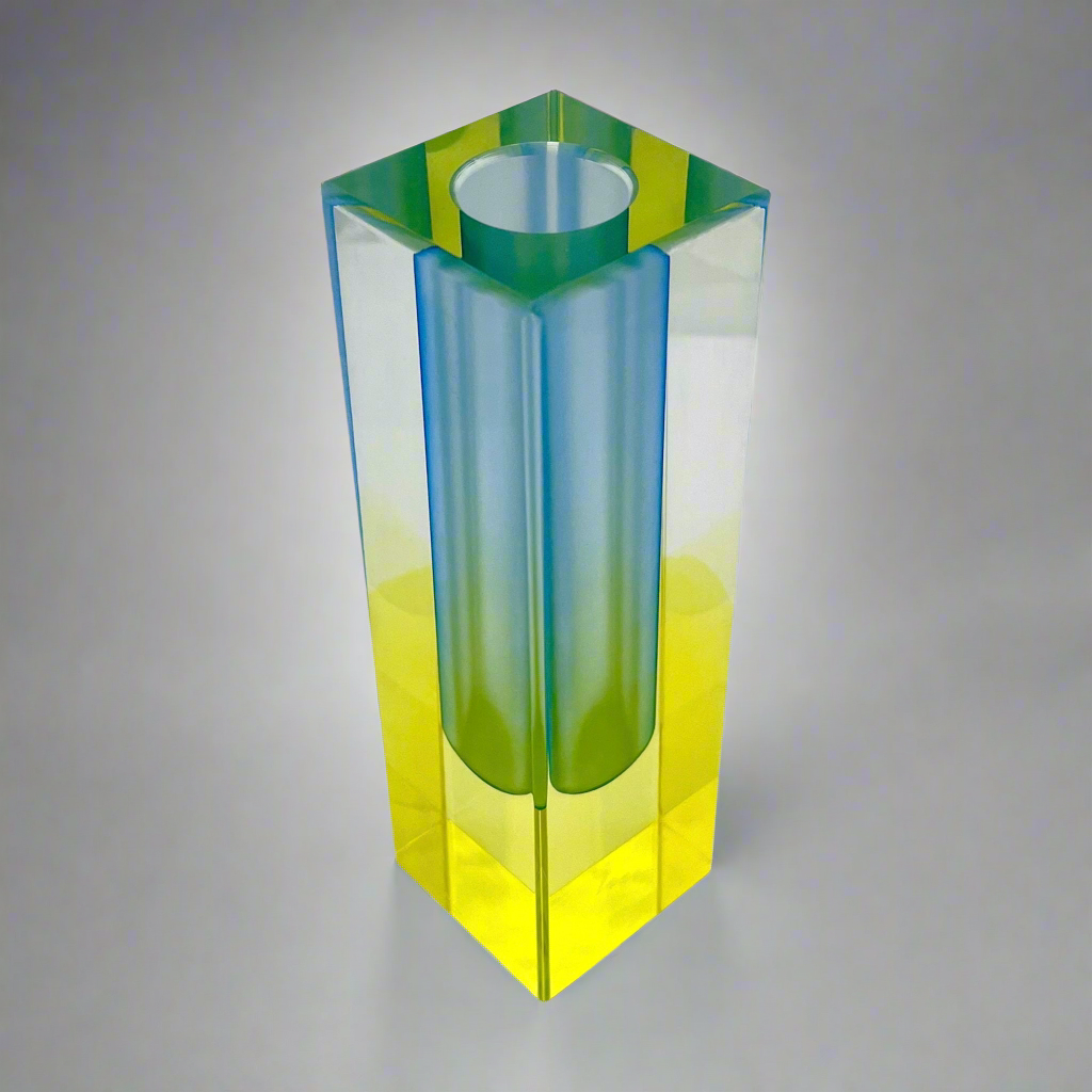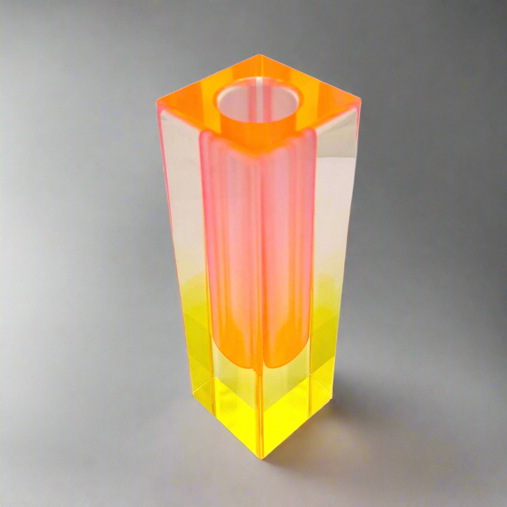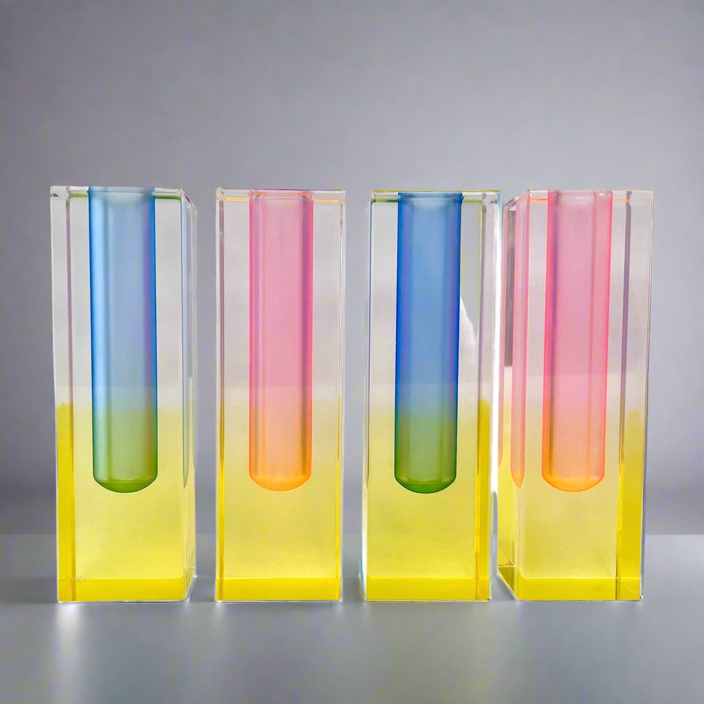 Studio Hattern’s vases are made of heavy walled acrylic with imbedded translucent colors, these acrylic vases make a statement. 6.25” tall.