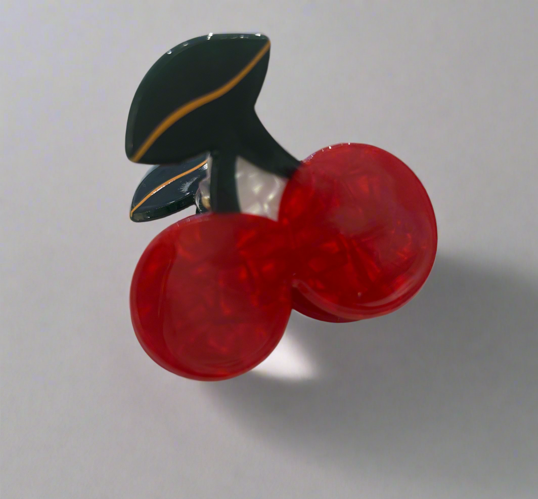 This cute pair of red cherries will brighten up your updo. Measures approximately 2” across.