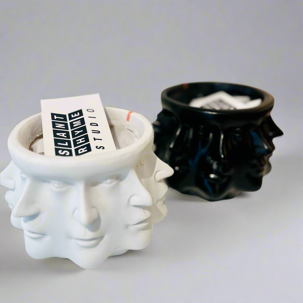 These 3-D multi face planter pots can also be used for other purposes, such as utensil coralling, Paintbrush, storage, or anything that you want put in a really cool pot. Resin cast. Measures 6”x6”x4”.