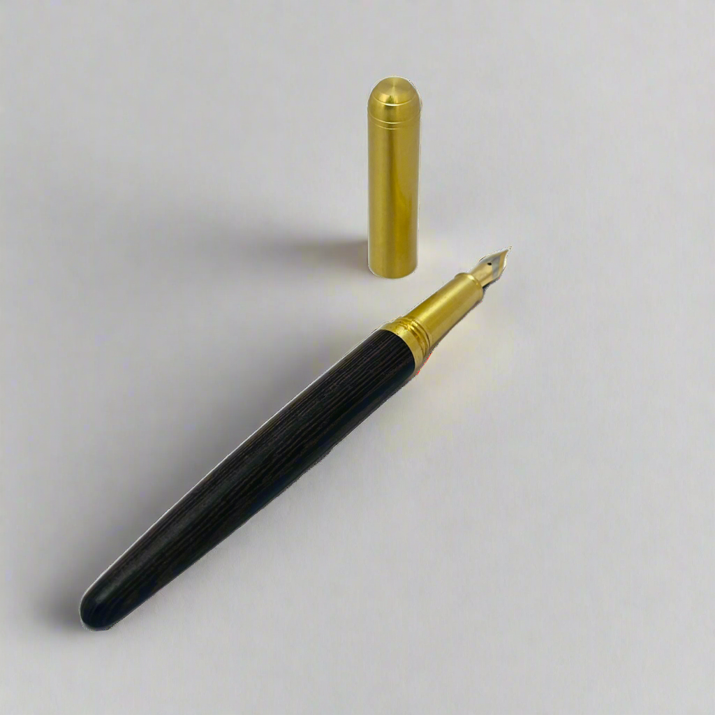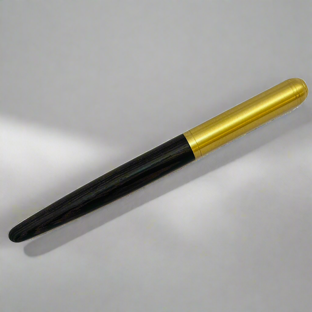 Brass nib and cap with simulated wooden handle. Ink not included.