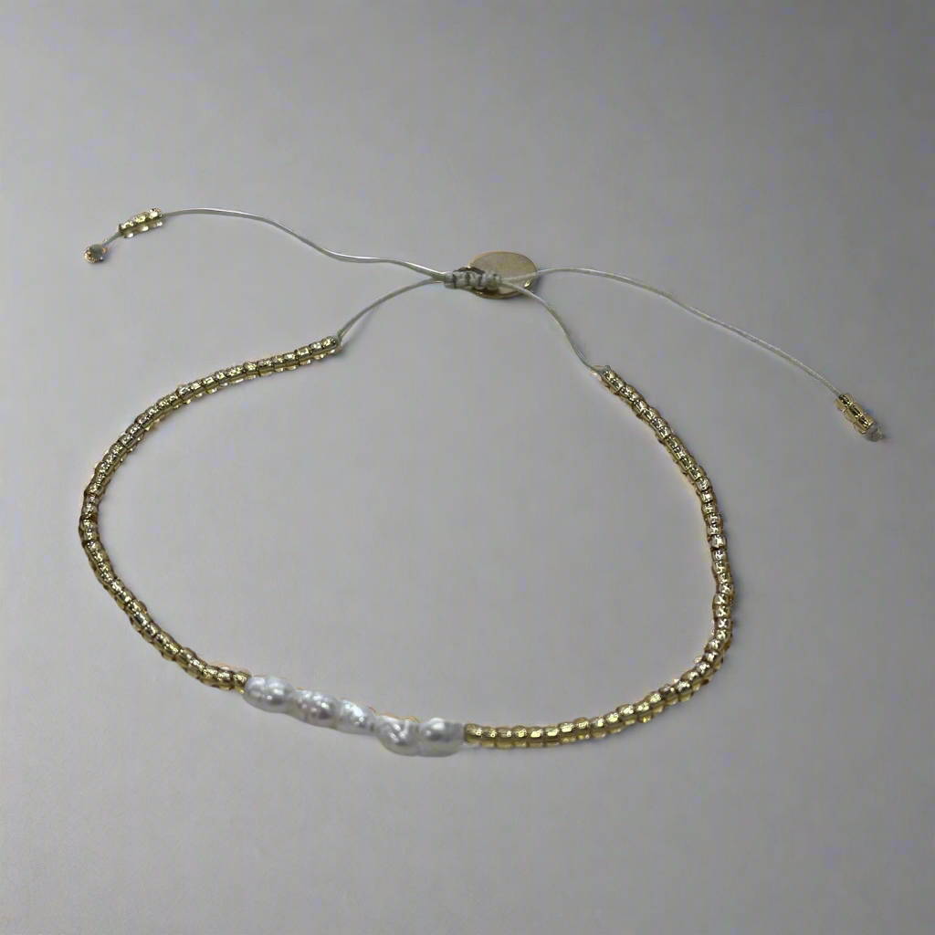 Featuring five small freshwater pearl beads and golden colored seed beads, this adjustable bracelet makes a simple elegant, statement.