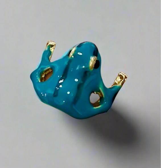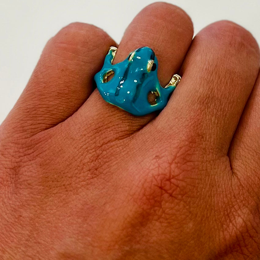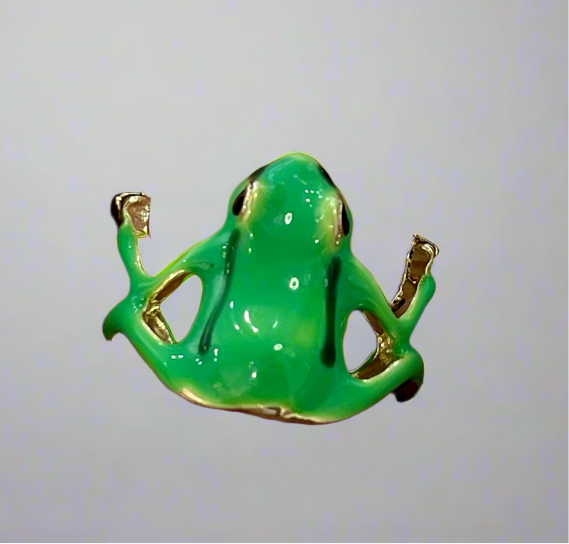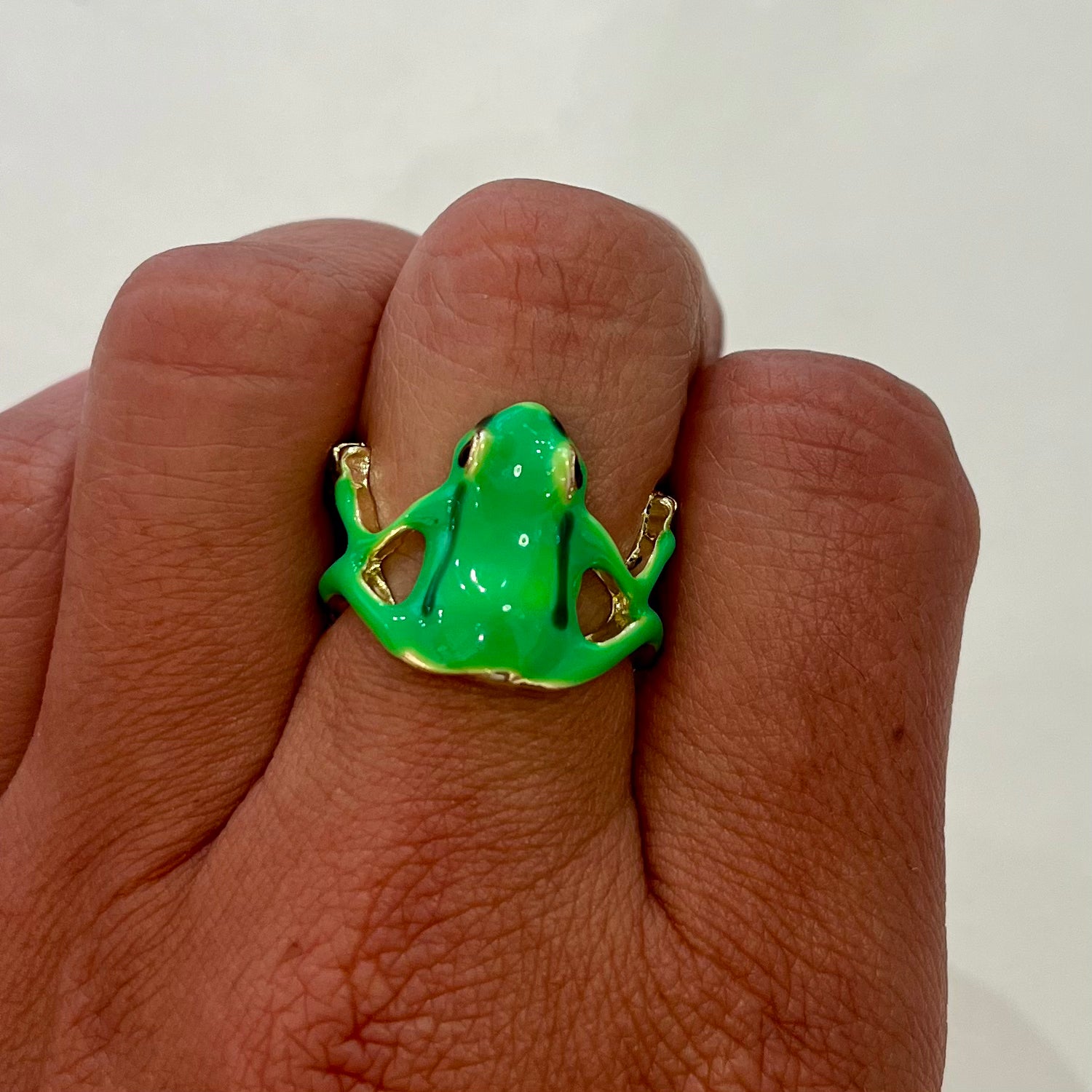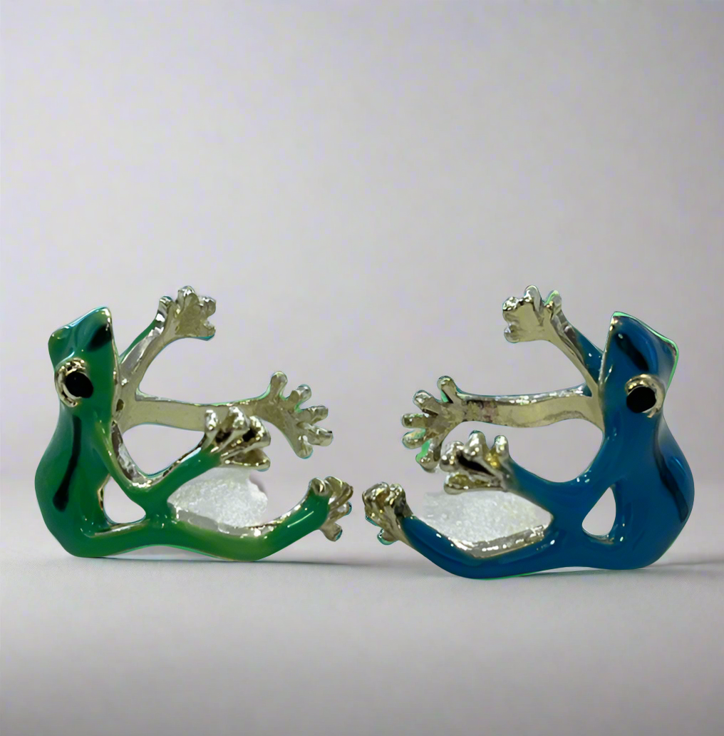 This tree frog ring comes in green or blue and is a enamel paint over metal. Adjustable by pulling or pushing on the legs.