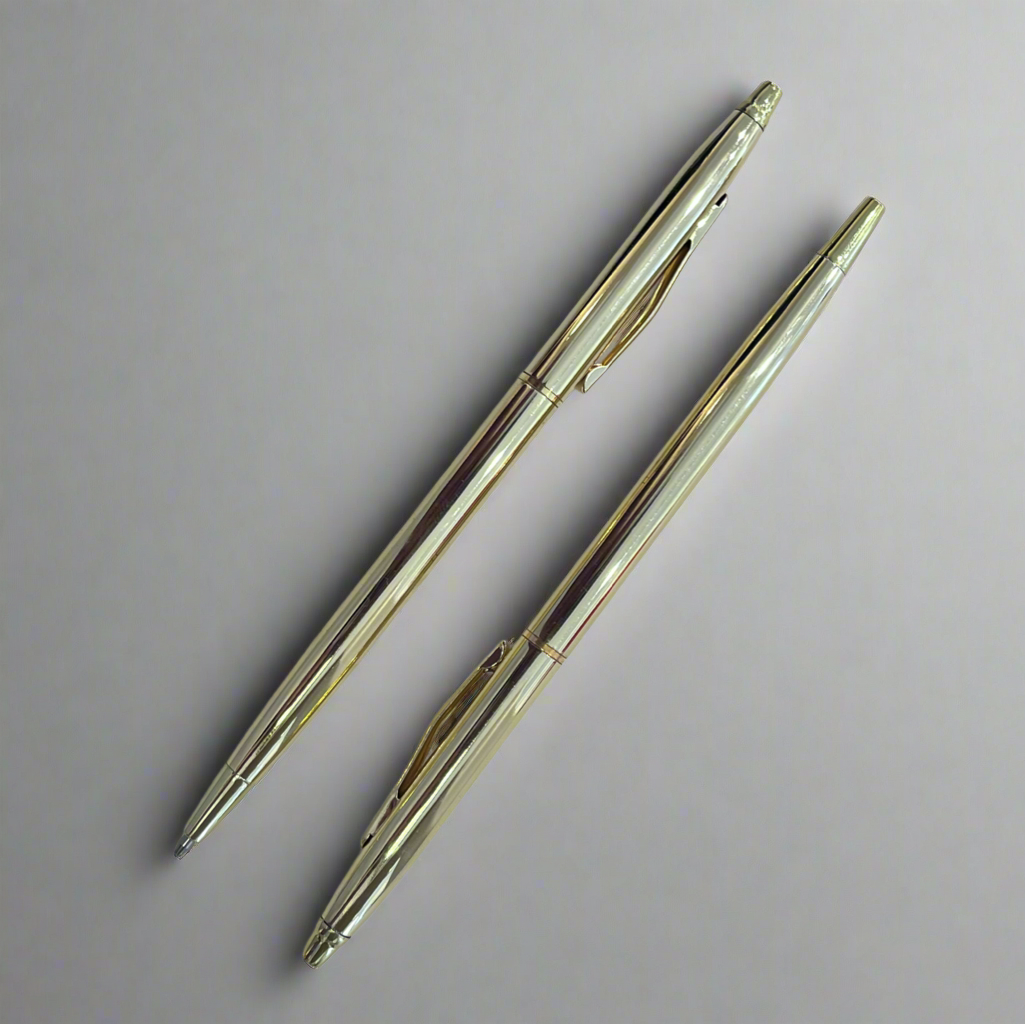 Slim retractable ballpoint pen in a glossy brass finish. Twist to open and close. Black ink. Measures approximately 6 inches long.