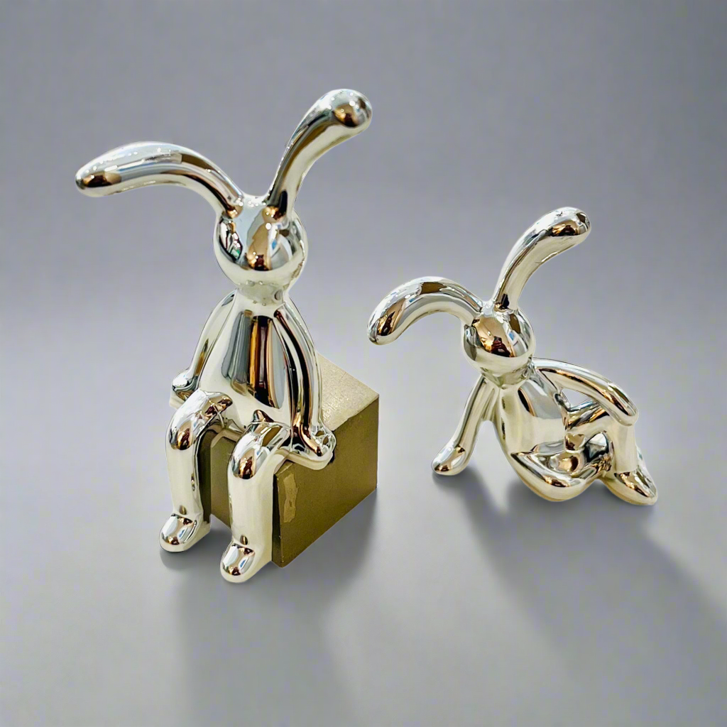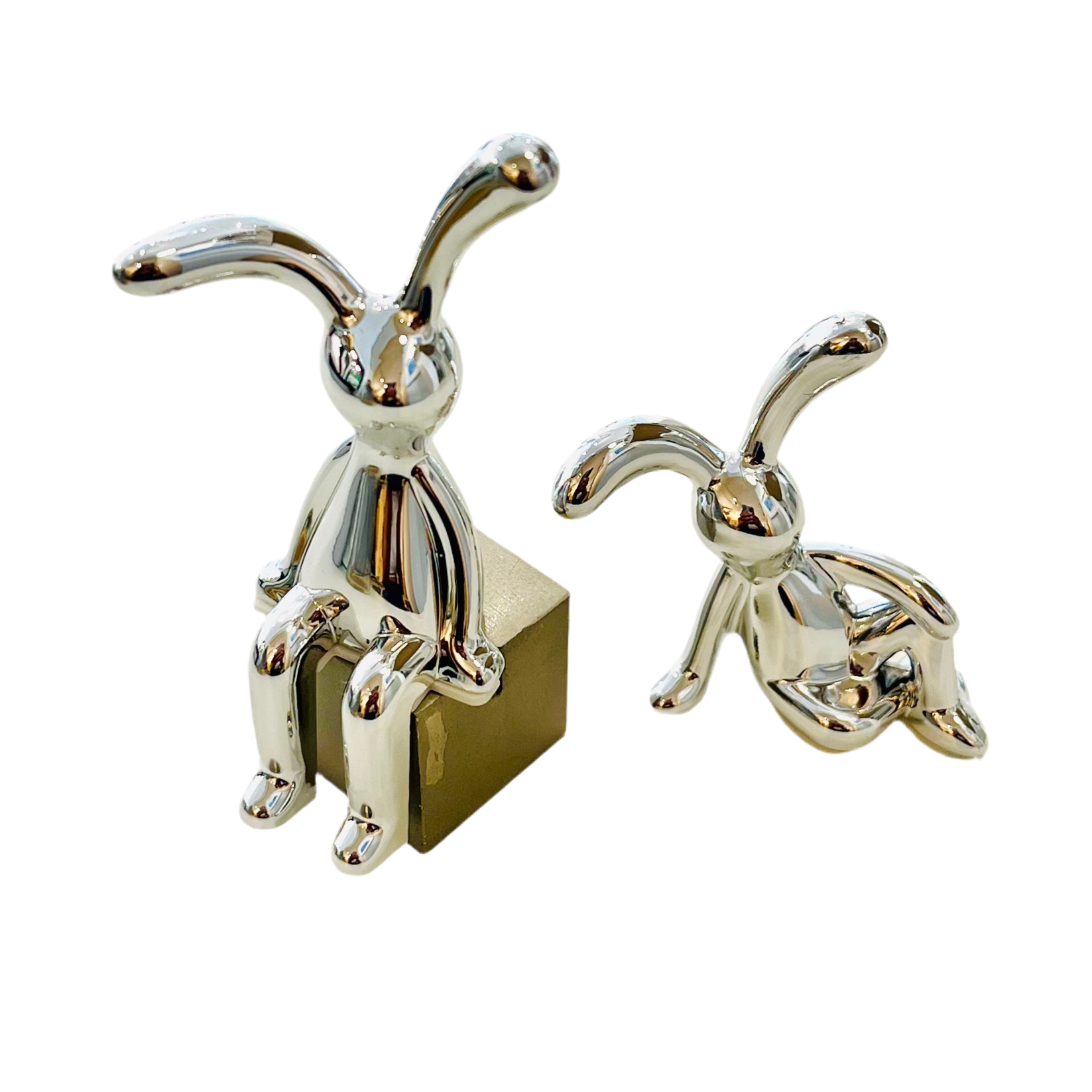 These little chrome-like bunnies will hop their way into your heart. With an optional adhesive bottom, they can stick to your dashboard, your desk, your computer or anywhere you need a little fun. Bunnies come in two styles: one is Seated and can perch on the edge of a shelf and the other is Lounging and can stay on any flat surface.