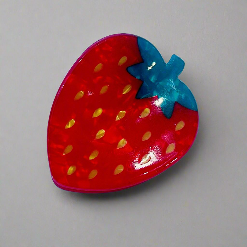 Make a big statement in a little way! This strawberry hair claw juices up your style. Measures approximately 1.5” across. Made of eco-friendly acetate.