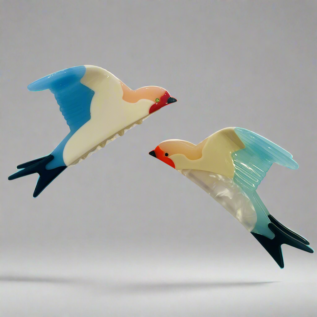 Available in pearlescent or solid, these lovely parakeet claw clips Measure approximately 2.75 inches and have a sparkly jewel eye. Resin.