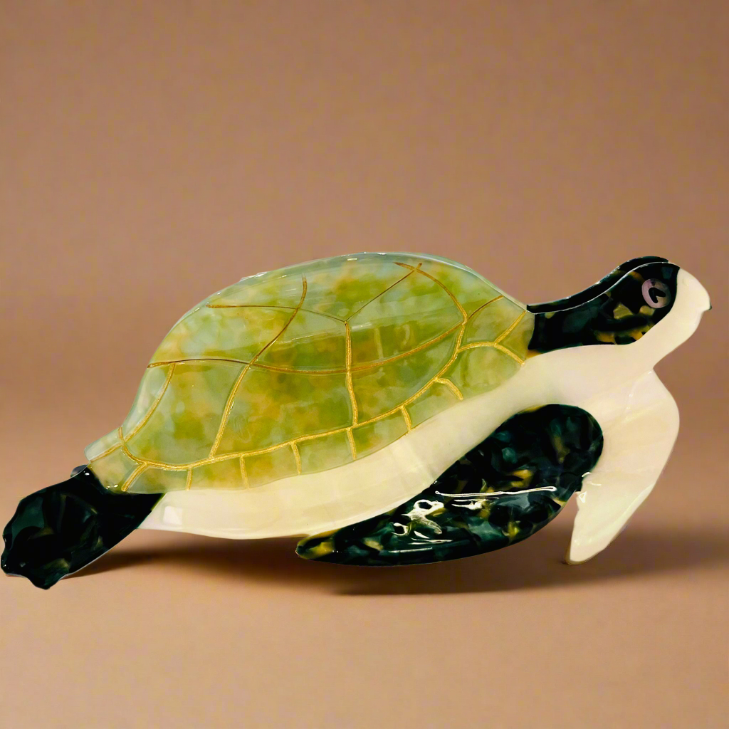 This gorgeous green sea turtle hair claw measures approximately 3.75” across and is a stunning, naturalistic shade of green. Also available in brown tortoishell.
